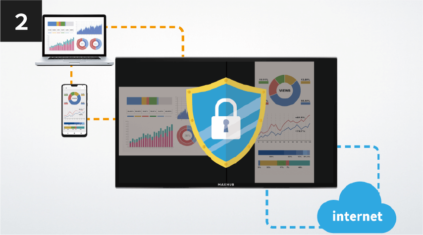 専用ドングルでワンタッチで画面共有、双方向で書き込み・操作が可能となっており、ホワイトボードや資料に書き込んだ内容もそのままデータ化することができます。MAXHUBは会議等でのコミュニケーションの質を向上し、双方向による意思疎通が可能となります。