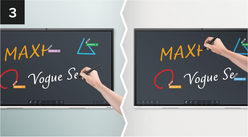 MAXHUB同士なら、ホワイトボードに双方向で書き込みが可能。遠隔地ともWEB会議アプリを使わずに議論が行える。