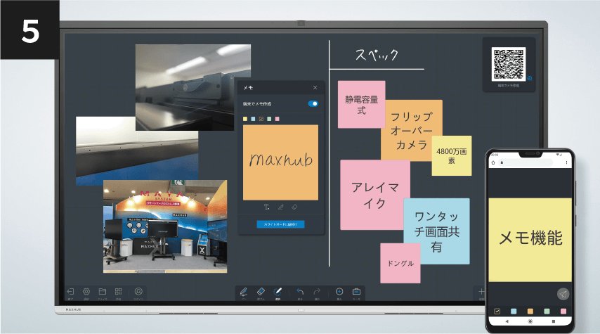 QRコードを手元のデバイスから読み込むことで、遠隔地からもファイルやメモをホワイトボード上に転送することができる。